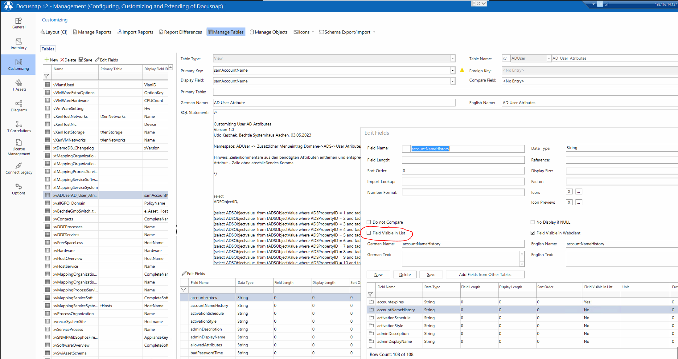 Das Customizing muss lediglich als Schema importiert werden. Anschließend findet man die View unter dem Punkt Inventar->Mandant->Infrastruktur->Domäne->Active Directory->AD User Attribute