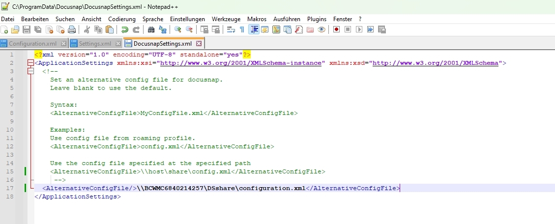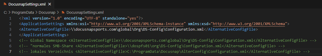 Wenn ich die "customized Funktionen" für alle DS User identisch im Zugriff haben möchte, muss die configuration.xml von User-Tree in einen allgemein zugänglichen (Share) verschoben werden. In der dafür zuständigen DocuSnapSettings.xml greift die Auflösung von DFS nicht, sodass ich beim Kunden dann eine alternative Pfadangabe verwenden muss.