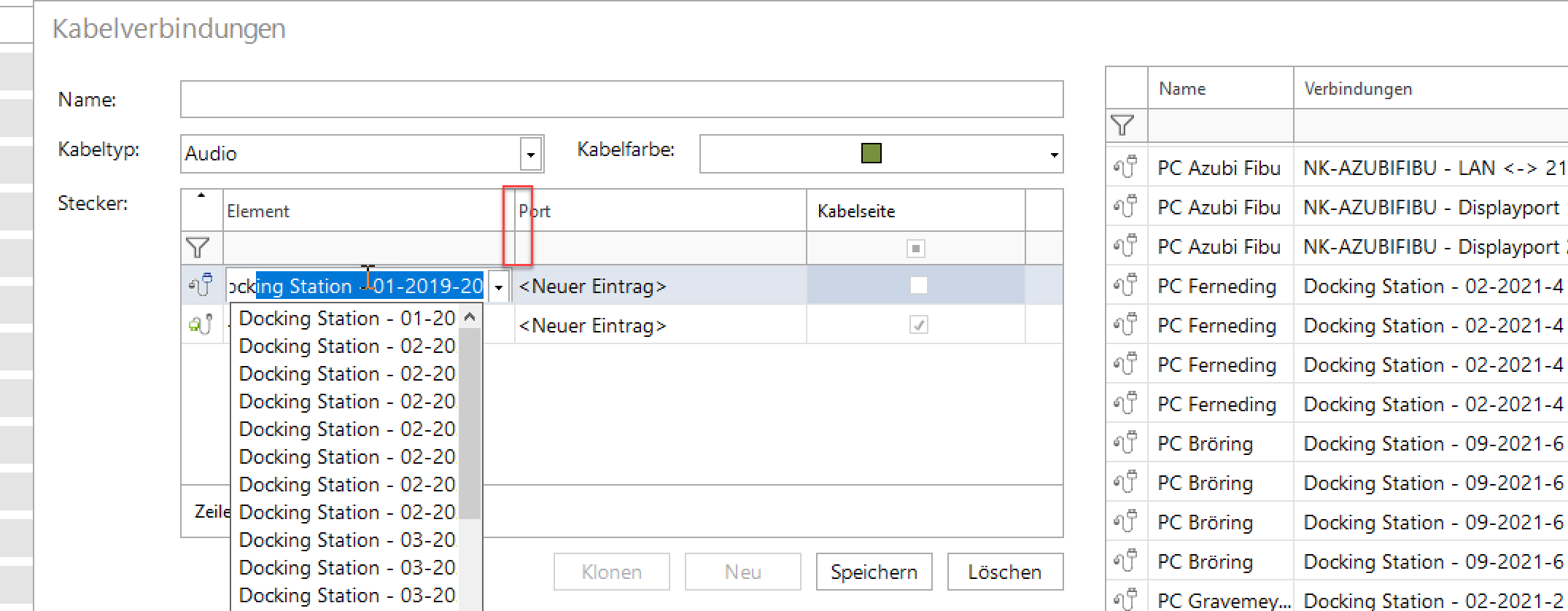 Bei der Eingabe von Kabelverbindungen muss man jedes Mal die Spaltenbreite anpassen, um den Eintrag korrekt zu lesen.