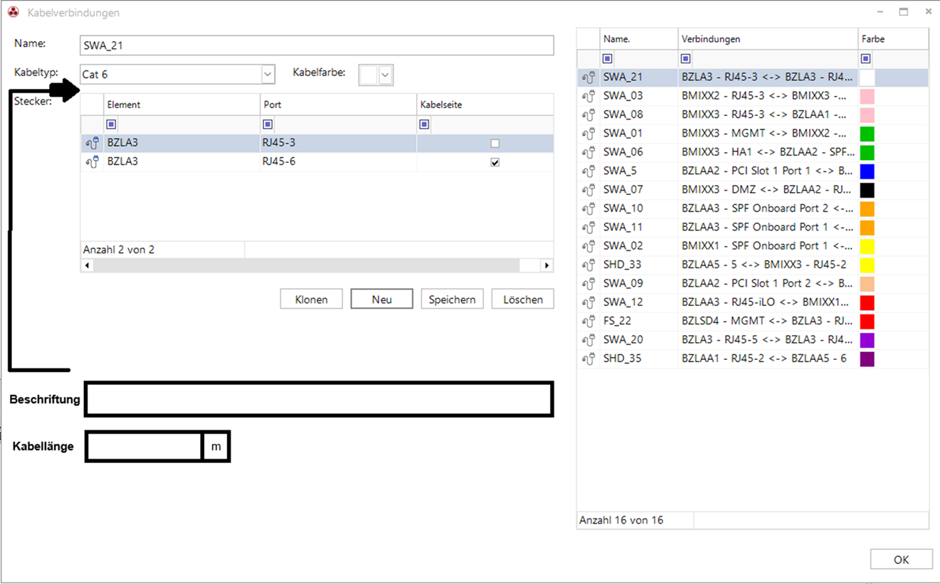 In den Kabelverbindungen wäre gewünscht, dass zu der Kabelverbindung, auch folgende weitere Eigenschaften mitgegeben werden können, die uns essenziell sind: